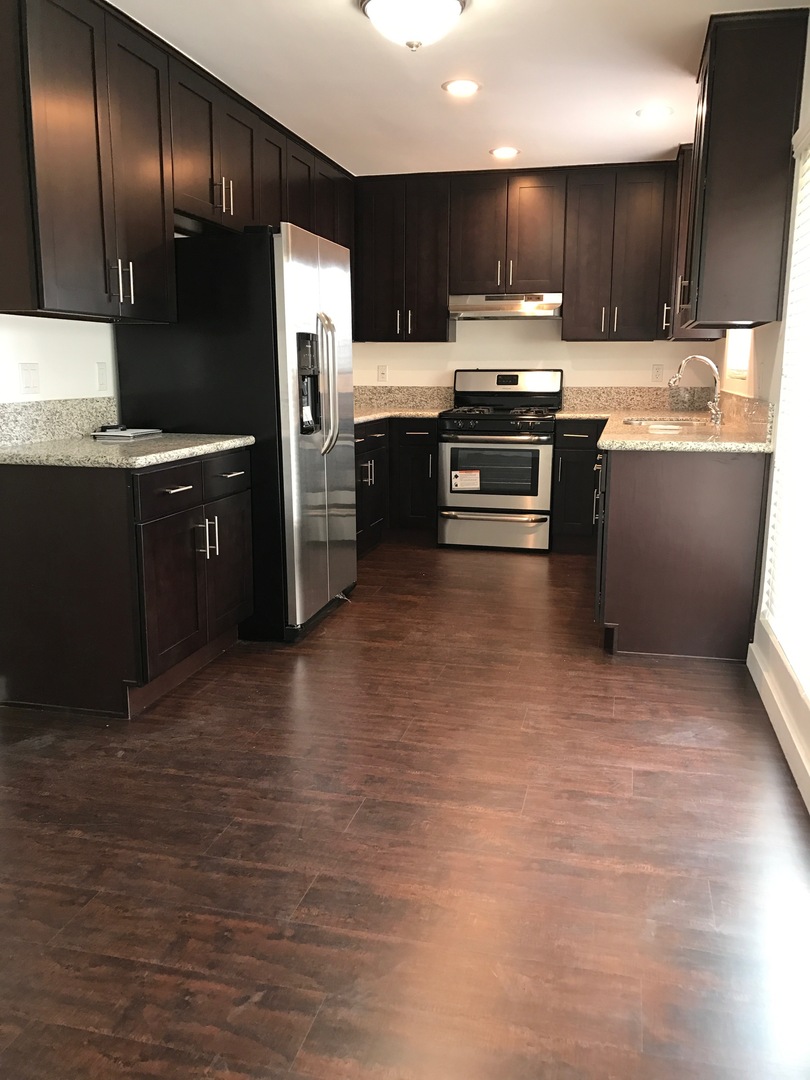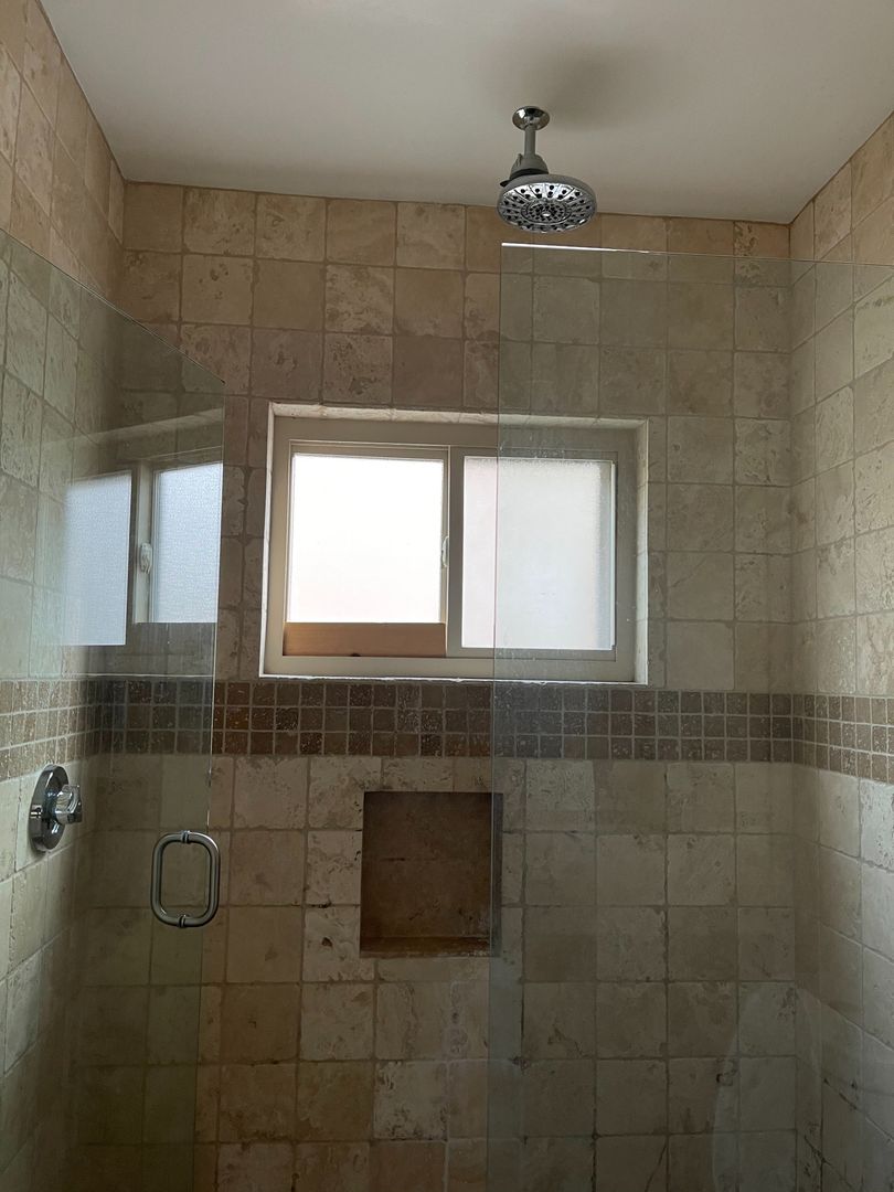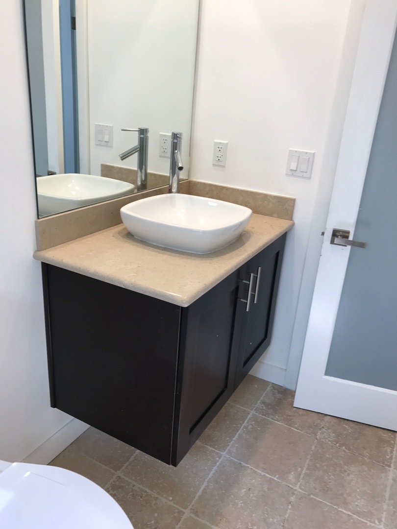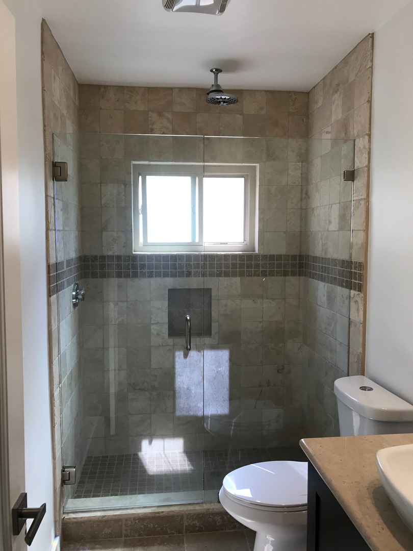 The kitchen has all new stainless steel and granite counter tops, with lots of storage. The bathroom has been remodeled with tile and stone in the shower and beautifully frosted glass doors. The large step in shower has a rain shower head.